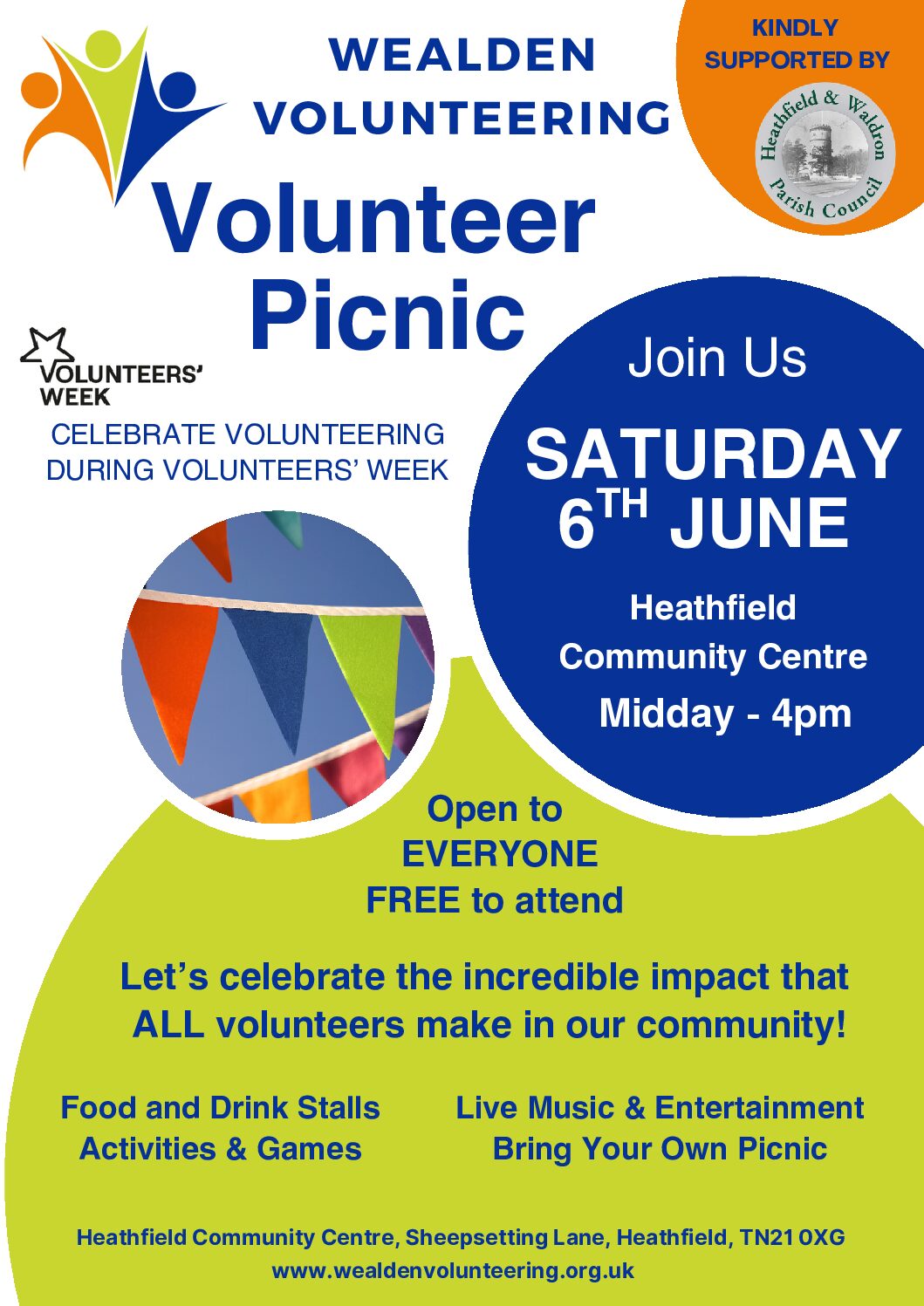 This year we’re celebrating the occasion with a Volunteer Picnic! It’s going to be taking place on Saturday the 6th June at Heathfield Community Centre.